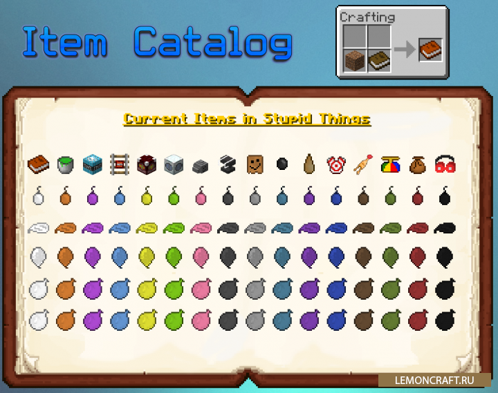 Мод Stupid Things добавит немного веселья в игру путем добавления дурацких предметов и блоков. Я бы их назвал не тупыми а прикольными. Например есть шарики с водой, TNT, которая не взрывает, а строит вокруг себя, дымовые завесы, куры, которых можно мочить и многое другое. Есть так же вещи, которые имеют длительное действие, например разноцветные шарики, которыми вы можете украсить свое жилище. Непрактичный, но веселый мод.