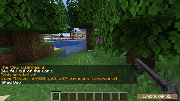 Мод на могилу для хранения вещей Simple Tomb добавляет в игру могилу в которую будут помещены вещи после вашей смерти и специальный ключ от нее. Держа ключ в руке вы увидите могилу на любом расстоянии, а так же сможете телепортироватся к ней. Для телепортации зажмите ПКМ держа ключ в руке.